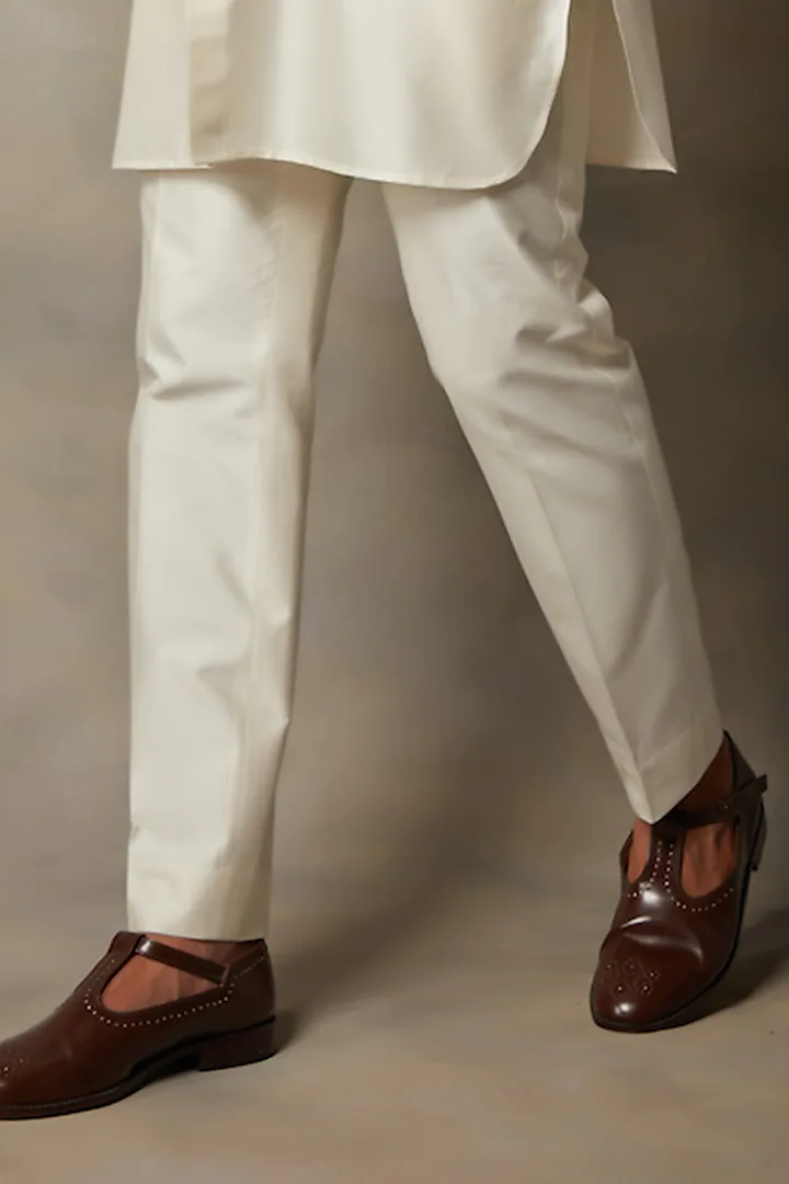 Featuring a beige and cream bundi jacket in rayon base with machine embroidery. It is paired with a matching cotton silk kurta and pants.