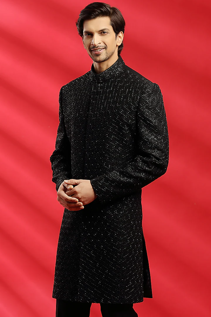 Featuring a black indowestern jacket in terry rayon base with handwork. It is paired with matching pants.