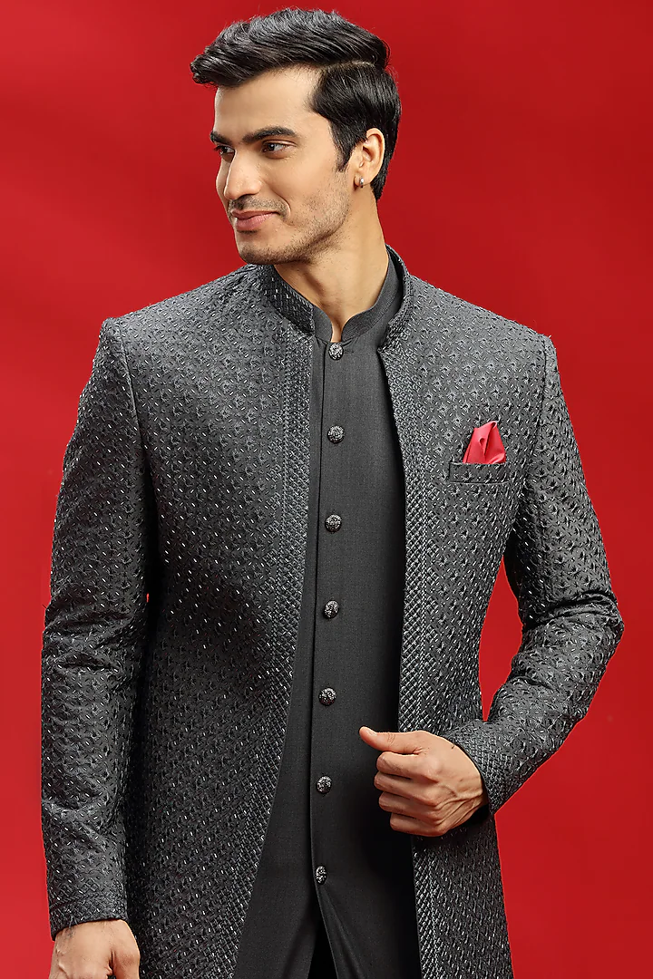 Featuring a charcoal indowestern jacket in terry rayon base with machine and handwork. It is paired with a matching kurta and pants.