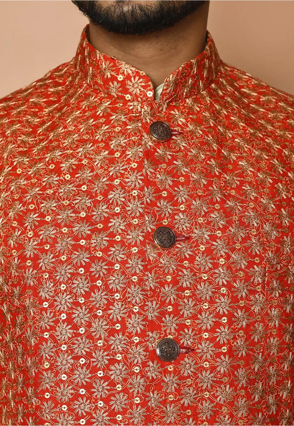 - This Sleeveless and Chinese Collar attire is Enhanced with Buttons, Resham and Sequins Work
