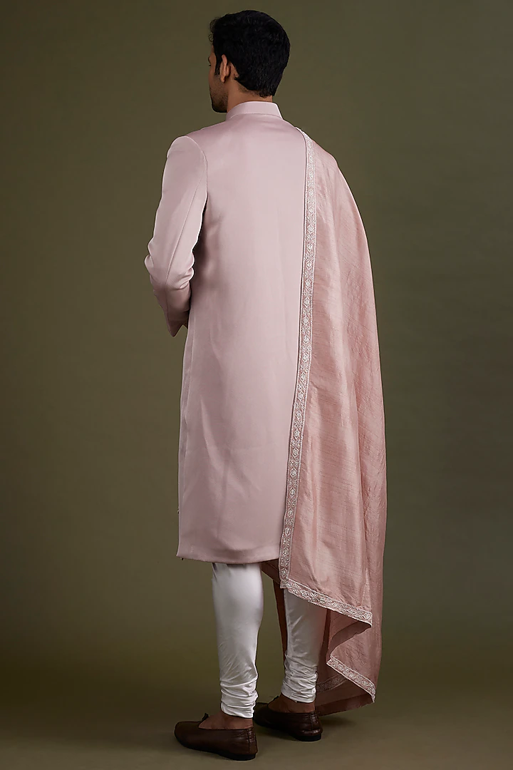 Featuring an english pink sherwani in scuba satin base. It is paired with contrasting satin lycra stretch pants and a matching silk dupatta having embroidery.