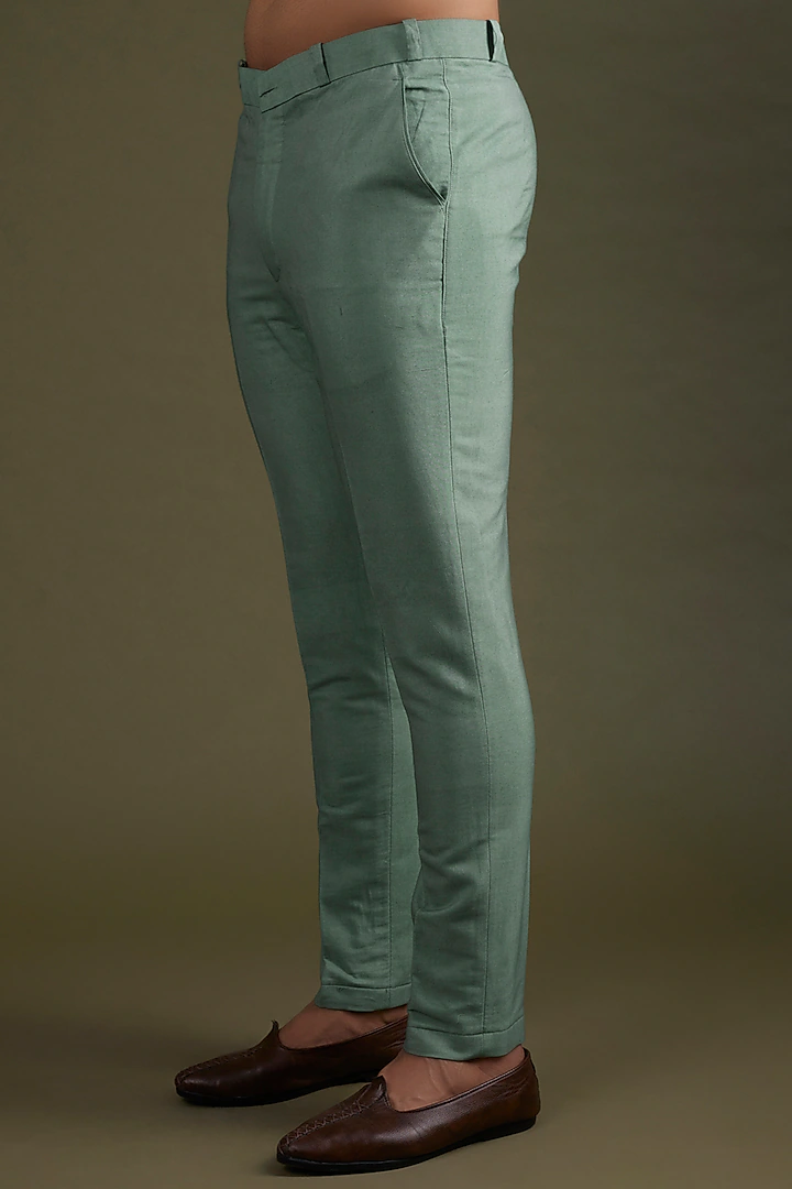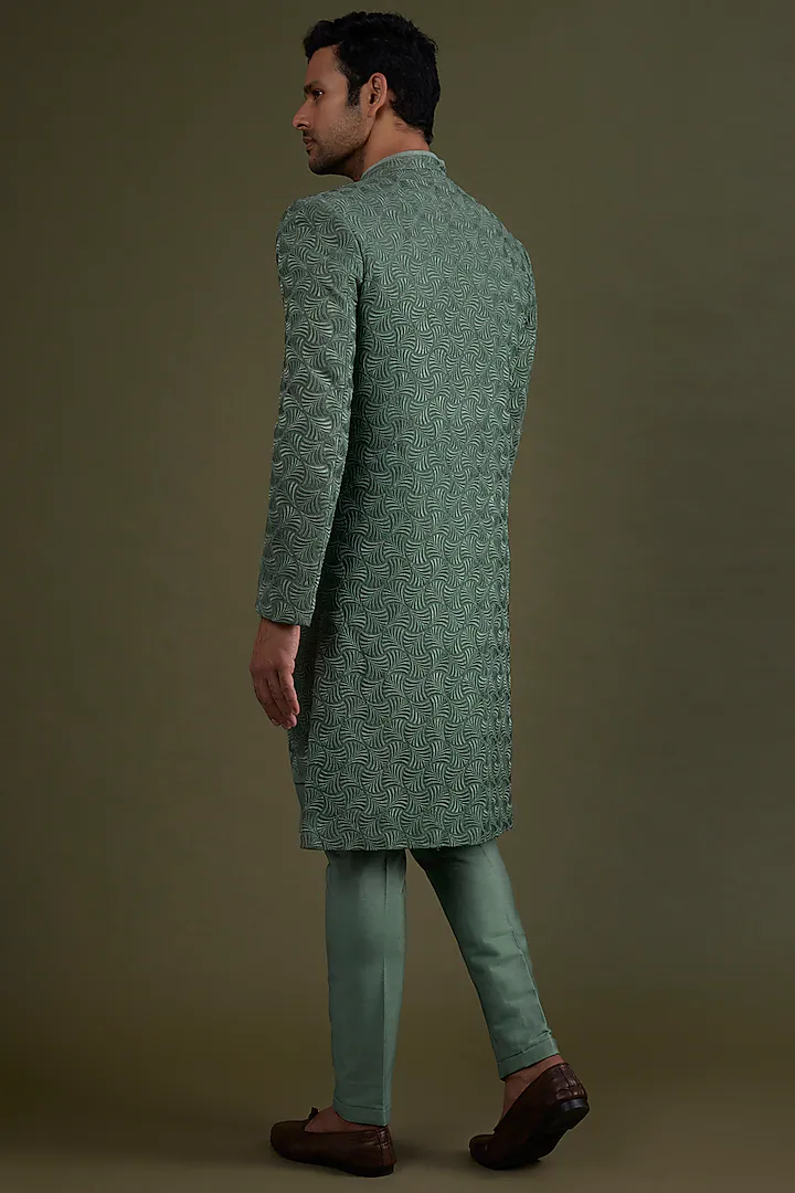 Featuring a jade green sherwani in georgette base with flocking and thread embroidery. It is paired with matching silk churidar pants.