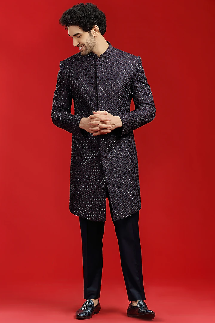 Featuring a navy blue indowestern jacket in terry rayon base with machine and handwork. It is paired with matching pants.