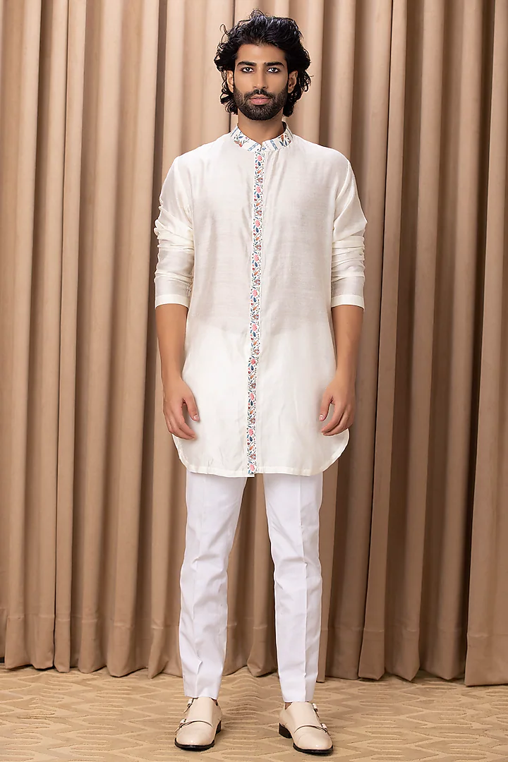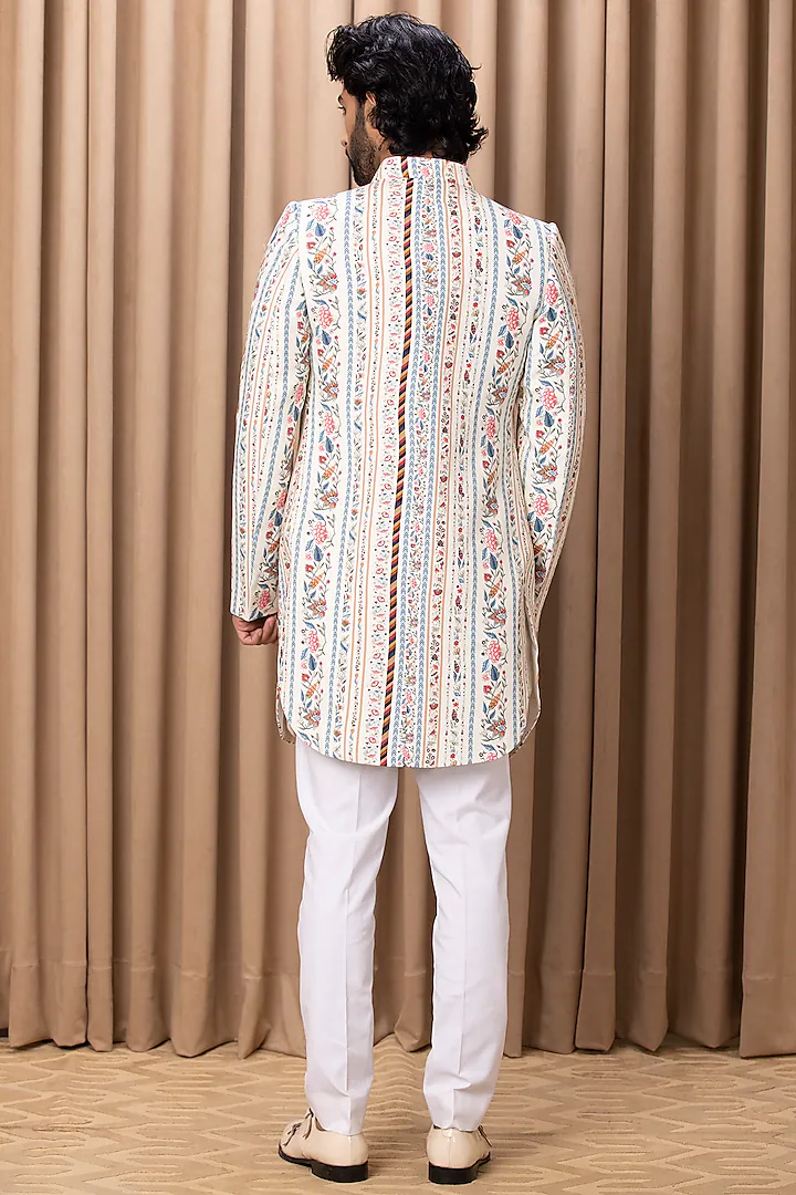 Featuring an off-white indowestern jacket in cotton and silk base with digital print and hand painting. It is paired with a matching kurta and ivory linen trousers.
