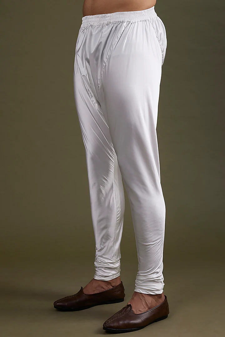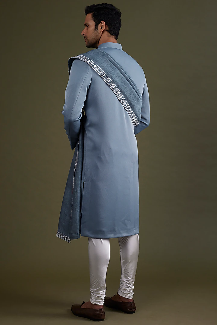 Featuring a steel blue sherwani in scuba satin base. It is paired with contrasting satin lycra stretch pants and a matching silk dupatta having embroidery.