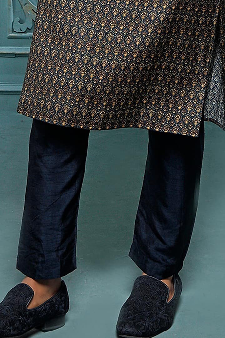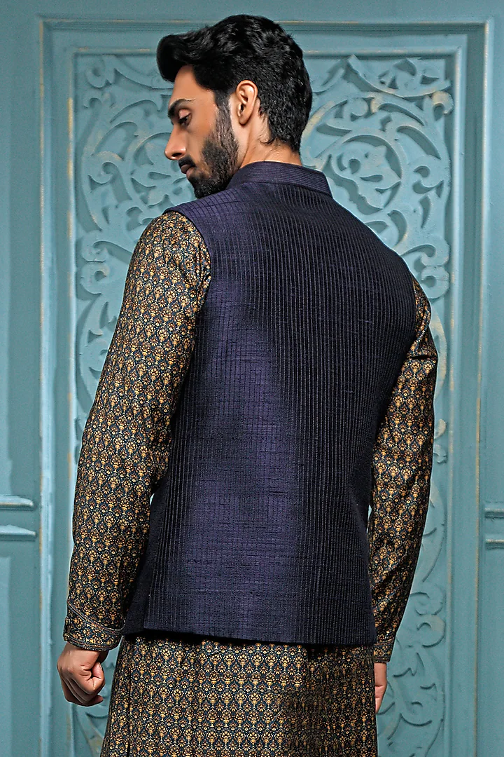 Featuring a teal bundi jacket in raw silk base. It is paired with a contrasting printed kurta and matching pants.