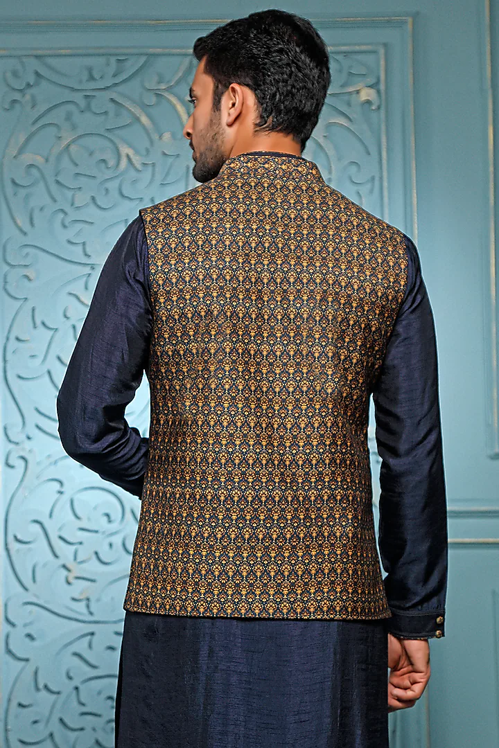 Teal Silk Kurta Set With Bundi Jacket