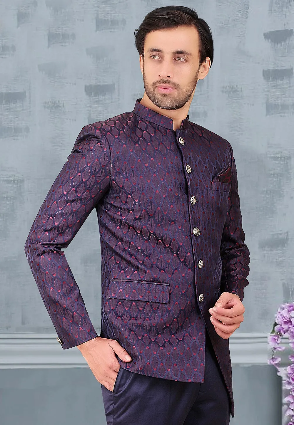 - This Chinese Collar and Full Sleeves attire is Enhanced with Button, Pockets and Woven with Resham